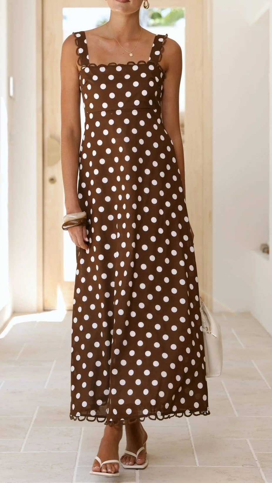 Embrace vintage-inspired elegance with this chocolate sundress, featuring delicate lace trim and adjustable straps for a flattering fit. Perfect for warm weather occasions, this maxi silhouette captures a retro aesthetic with modern comfort. Ideal for summer gatherings, beach days, or casual outings where timeless style meets effortless sophistication.