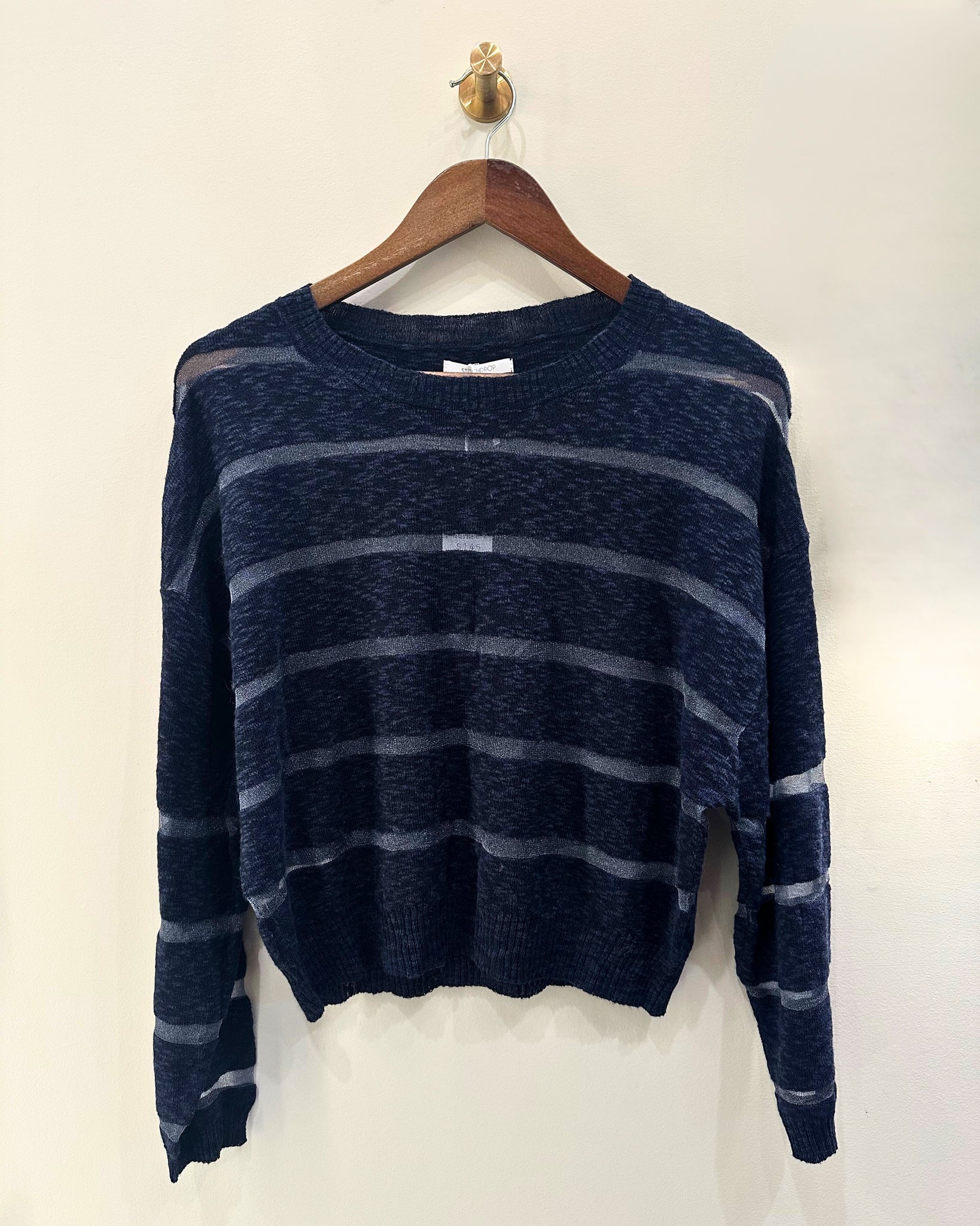 The Whitecaps Sweater features a relaxed drop shoulder design and a comfortable crew neck, perfect for everyday wear. Its deep midnight blue color is beautifully accented with a sparkling sheer stripe, adding a subtle touch of elegance. This sweater combines cozy style with a hint of shimmer, making it a versatile addition to your wardrobe.